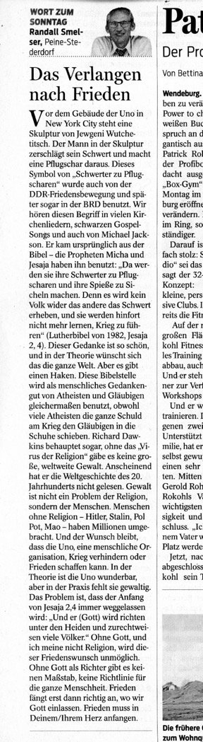 In front of the UN Headquarters in New York City stands a sculpture from Jewgeni Wutchetitsch. The man in the sculpture is beating his sword and making a plowshare out of it. This symbol from “from Swords into Plowshares“ was also used by the East German Peace Movement and later also in the West Germany. We hear this phrase in many hymns, Spirituals and even Michael Jackson. The phrase comes originally from the Bible – the prophets Micha and Isaiah used it. “They will beat their swords into plowshares and their spears into pruning hooks. Nation will not take up sword against nation, nor will they train for war anymore” (Is.2:4 NIV).